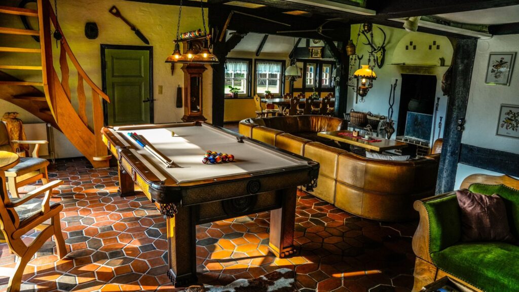 Im Erdgeschoss erwartet Sie ein großzügiger offener Wohnbereich, der das Herzstück unseres Hauses bildet. Hier finden Sie ein behagliches Wohnzimmer, das mit seinem rustikalen Charme und seinem einladenden Ambiente zum Verweilen einlädt. Bequeme Polstermöbel bieten Gelegenheit zum Entspannen, während ein knisternder Kamin an kühlen Abenden für wohlige Wärme sorgt. Der Tischkicker verspricht unterhaltsame Turniere, während der Billardtisch am großen Panoramafenster mit Blick in den üppigen Garten für viel Spaß und Unterhaltung sorgt.