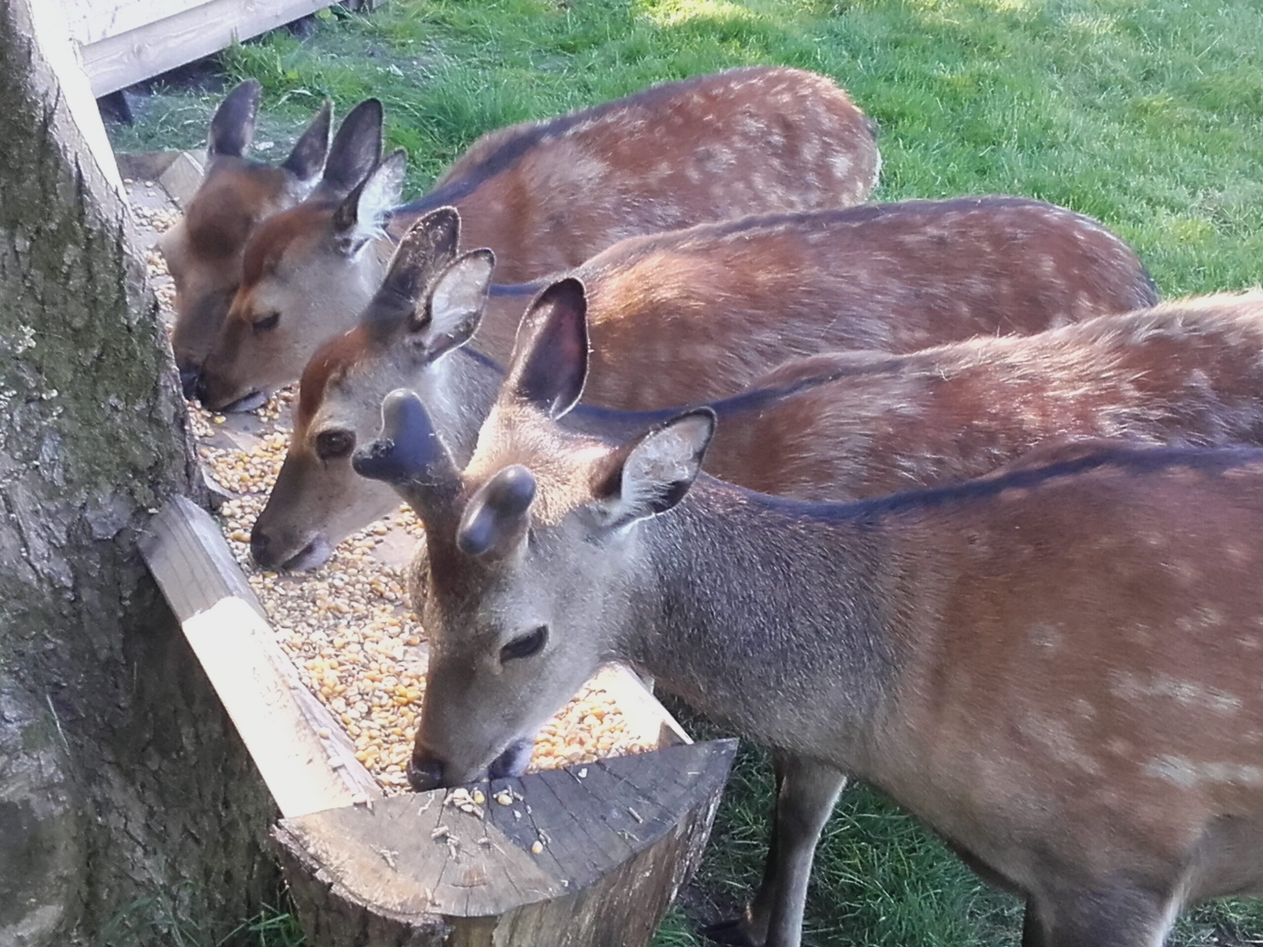Sika Hirsche – Eine Herde mit durchschnittlich 9 Tieren befindet sich wenige Meter hinter dem Haus. Zwischen Juni und August erwarten wir die Geburt der Kälber. Ab Oktober können Sie live das Brunftgeschehen vom Kaminzimmer aus beobachten. Von dort haben Sie auch einen guten Blick auf die Futterstelle.